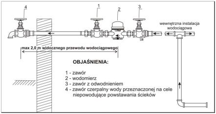 Krok 3. Wykonanie instalacji wodomierzowej wraz z armaturą towarzyszącą odbywa się własnym staraniem oraz na własny koszt Inwestora. Do warunków technicznych dołączony zostaje schemat (rys. 1), według którego należy wykonać węzeł wodomierzowy.